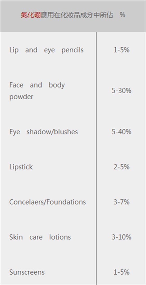 化妆品级氮化硼粉末可应用于粉底粉膏、蜜粉、唇膏、爽身粉、眼影、腮红、防晒乳霜与保湿护肤品等。